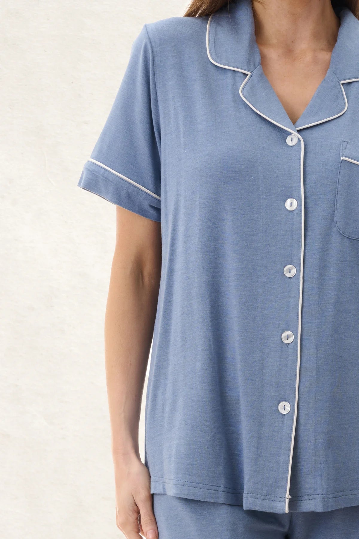 Discover the epitome of relaxation with this short pyjama set in Dusk Marle, crafted from marled slinky knit in luxurious Modal fabric. Known for its buttery soft touch and excellent breathability, Modal enhances the comfort of this set, making it a delight against the skin.