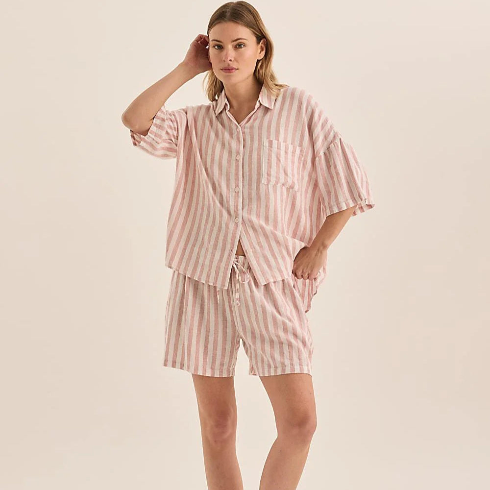 The slightly longer button-through top, combined with extra drop sleeves and a handy pocket detail, creates a stylish oversized look. The shorts have an elasticated waist with a drawstring for a customizable fit.