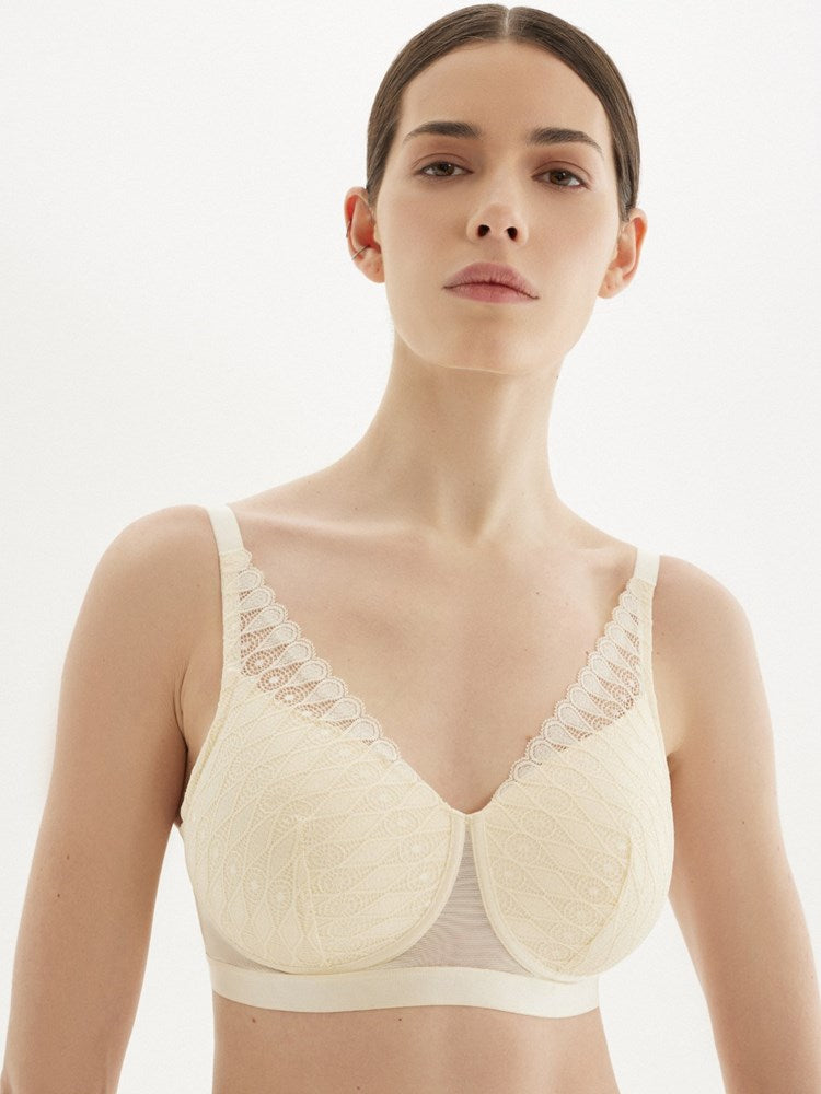 - Translucent lace reaches into the shoulder, high over the smooth moulded cups