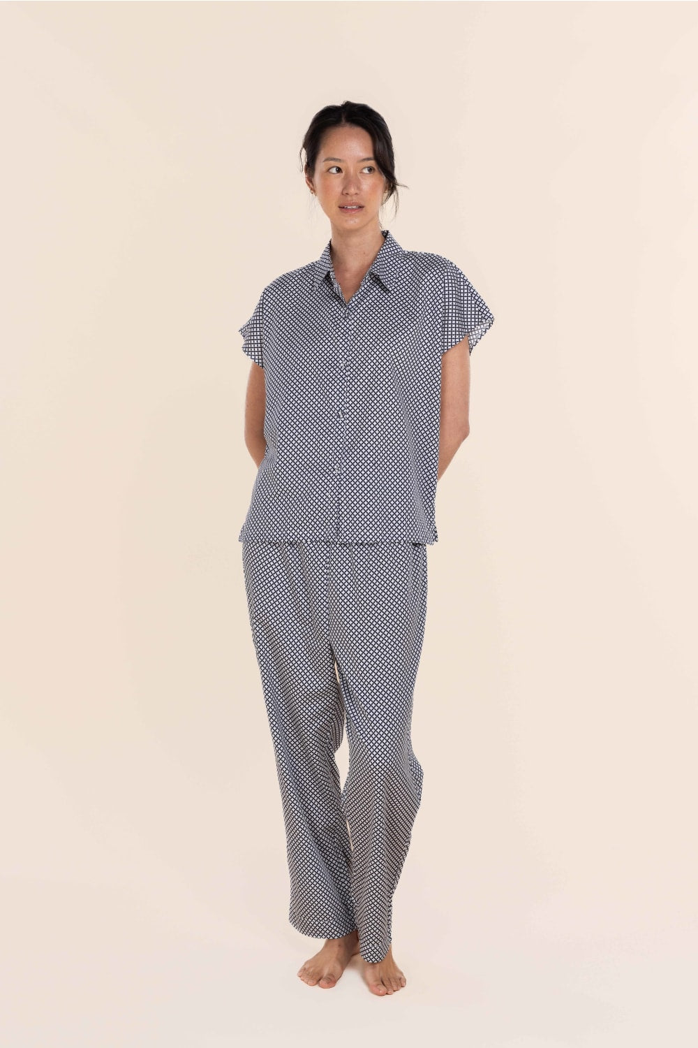 Explore comfort and charm with the Marlie pyjama set featuring a charming navy small diamond pattern on white. This set includes a wide-style short sleeve button-through top and wide-leg pants with an elasticated waist and drawstring, ensuring a relaxed fit.
