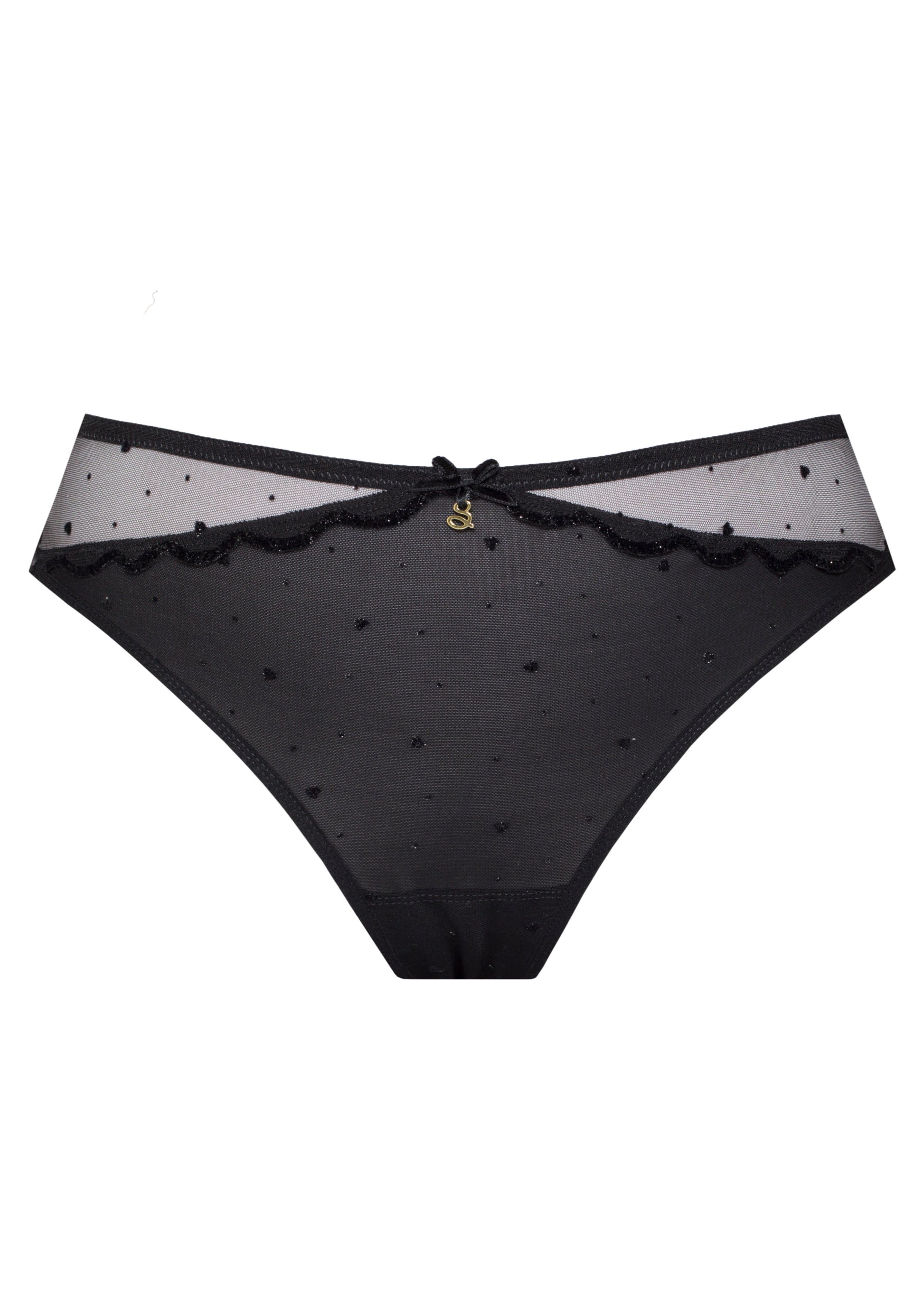 Playful yet refined, the Melania Cheeky Brief is designed to highlight your curves with its flattering cut and semi-sheer black fabric. Scattered with tiny embroidered hearts, this piece radiates romance, while gold detailing enhances its sophisticated appeal. The cheeky fit offers just the right amount of coverage, blending flirtation with timeless elegance.