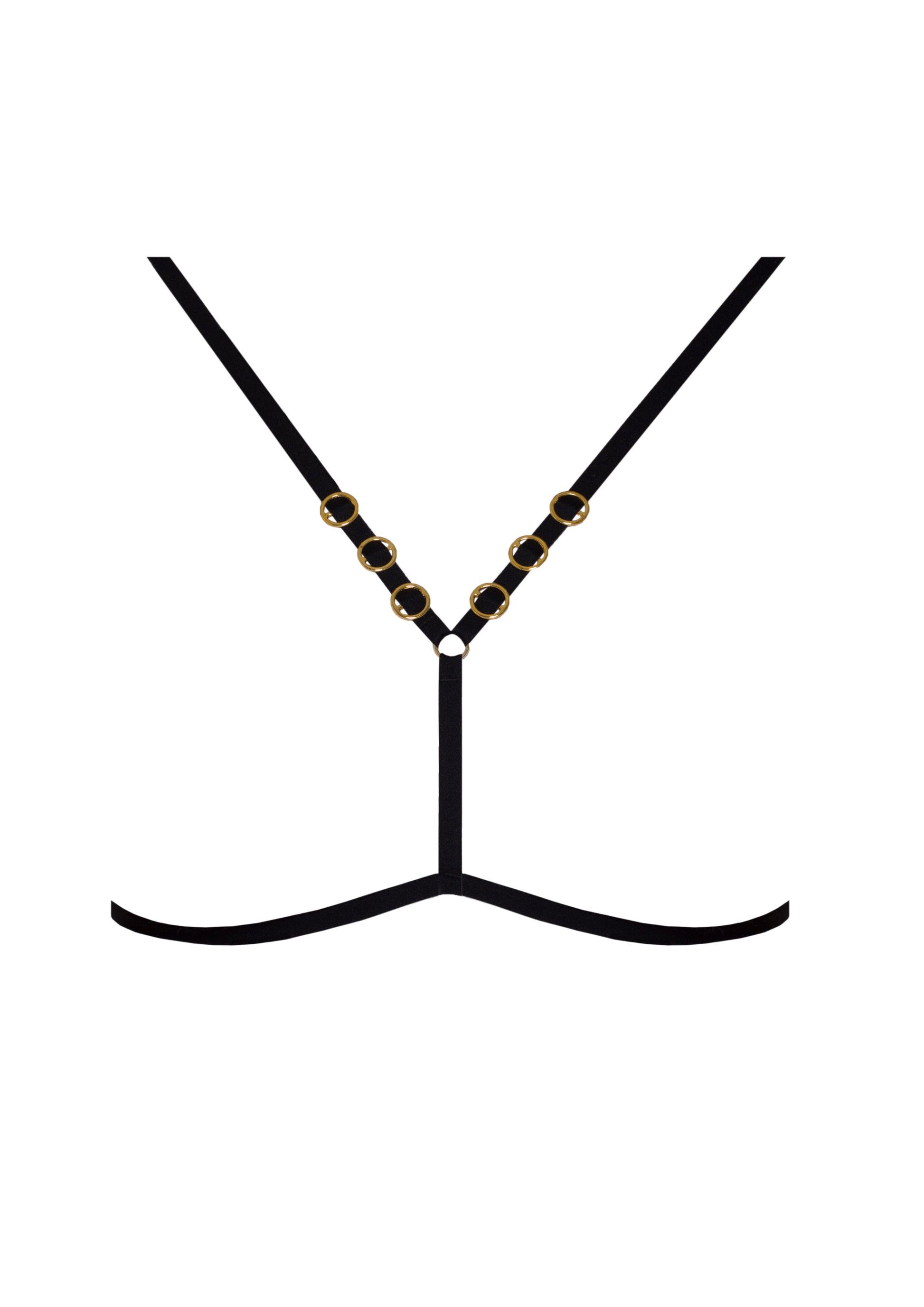 A bold yet elegant addition to the Melania collection, the Harness is designed to accentuate and enhance your lingerie ensemble. Crafted from sleek black elastic straps, it features refined gold ring details that add a touch of sophistication and modern edge. The adjustable fit allows for a comfortable and customizable wear, making it the perfect statement accessory to elevate any bra or lingerie set.