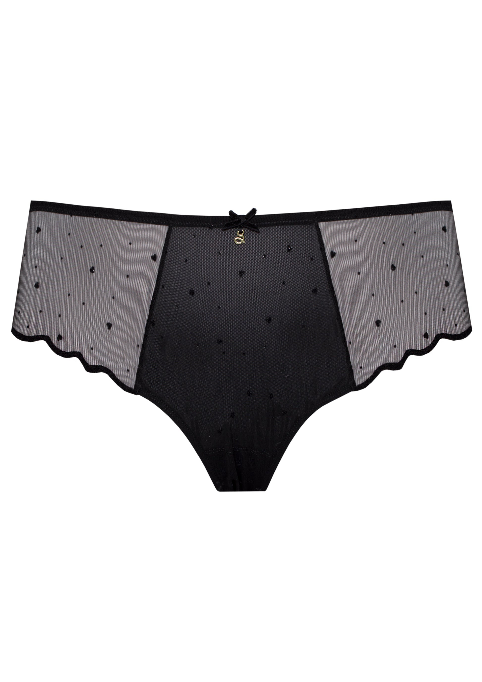 A timeless piece with a modern romantic twist, the Melania Midi Brief features soft, black sheer fabric decorated with a delicate array of tiny embroidered hearts. Offering a flattering mid-rise fit with moderate coverage, this design is as comfortable as it is captivating. The refined gold accents add an element of luxury, making it the perfect balance between elegance and everyday wear.