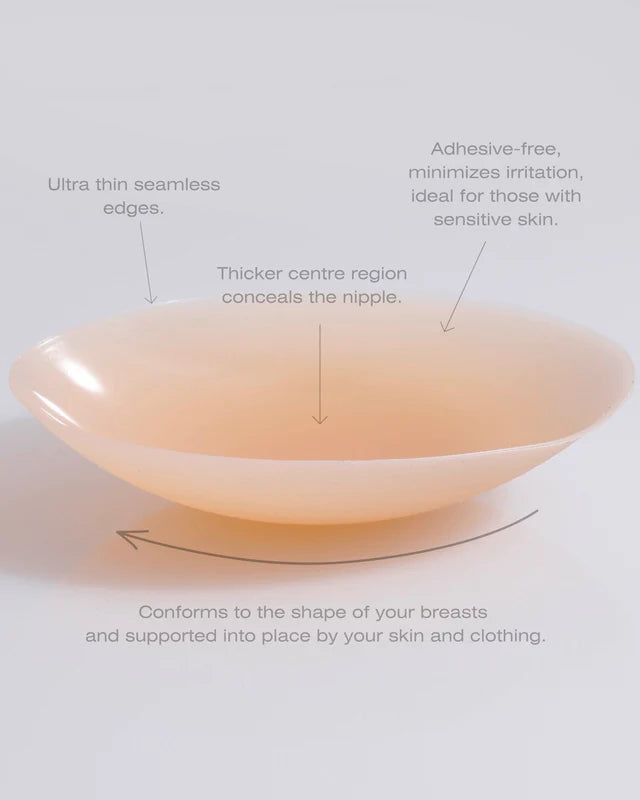 Our non-adhesive nipple covers are meticulously crafted from 100% medical-grade Silicone. Engineered to grip to your chest using your body's natural heat, these covers are designed to be worn under form fitting tops and dresses and are securely held into place by your clothing.