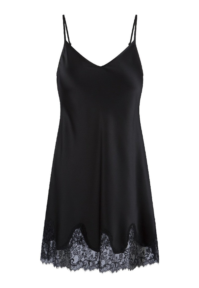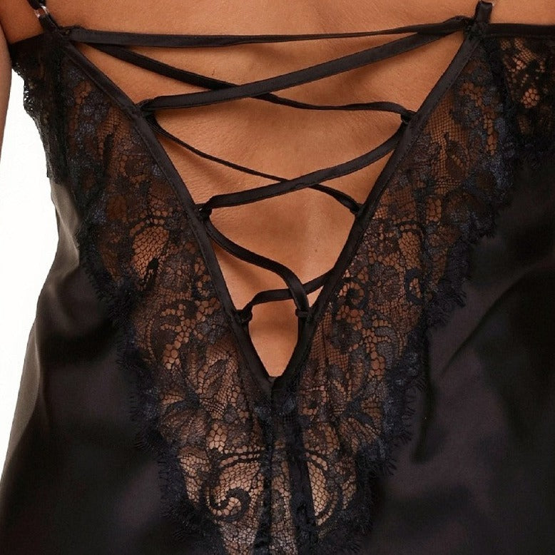 - The chemise is made of satin and is finished with elegant lace along the neckline and hem
