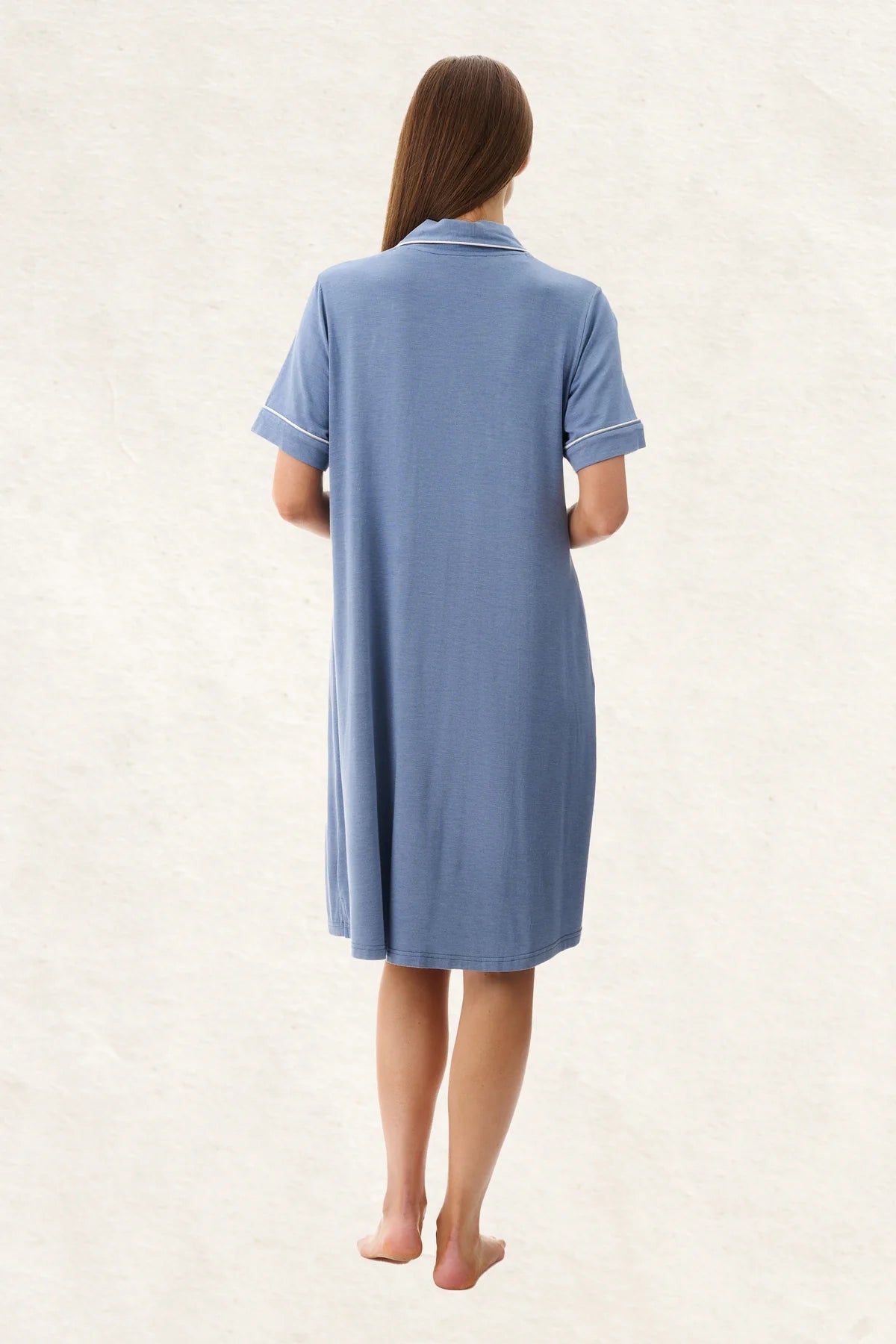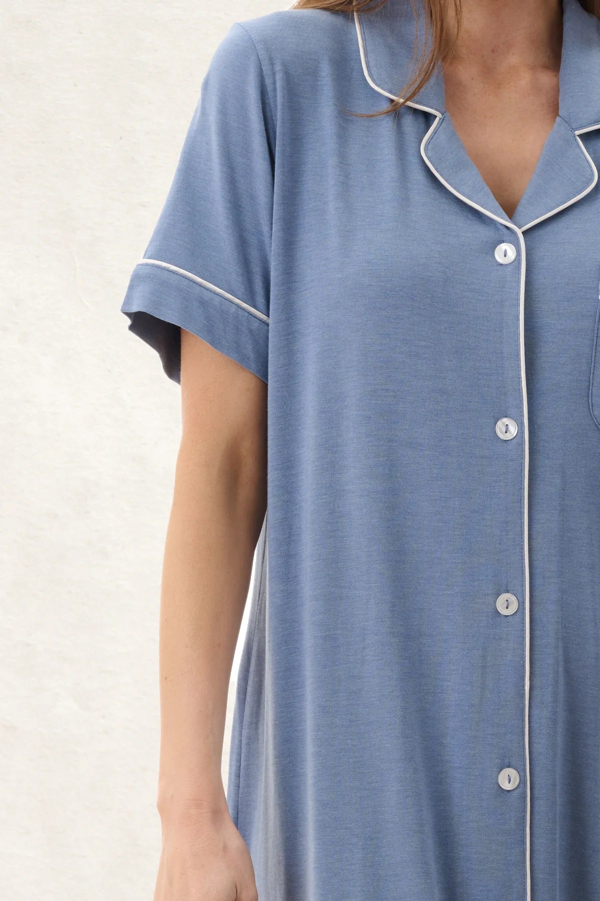 The sleepshirt features a striking white satin piping feature along the front opening, collar, sleeve and chest pocket, providing the perfect blend of comfort and functionality for lounging and a peaceful night's sleep.