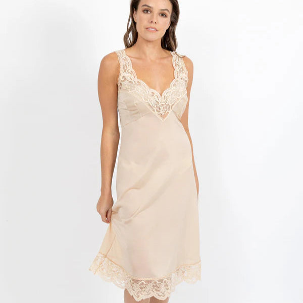 Lace trimming brings a touch of luxury to this soft and lightweight full slip. Designed with a V-neckline and built-up lace shoulders. Wear under dresses (or with skirts) for a feminine and modest extra layer that slims and streamlines weightlessly.